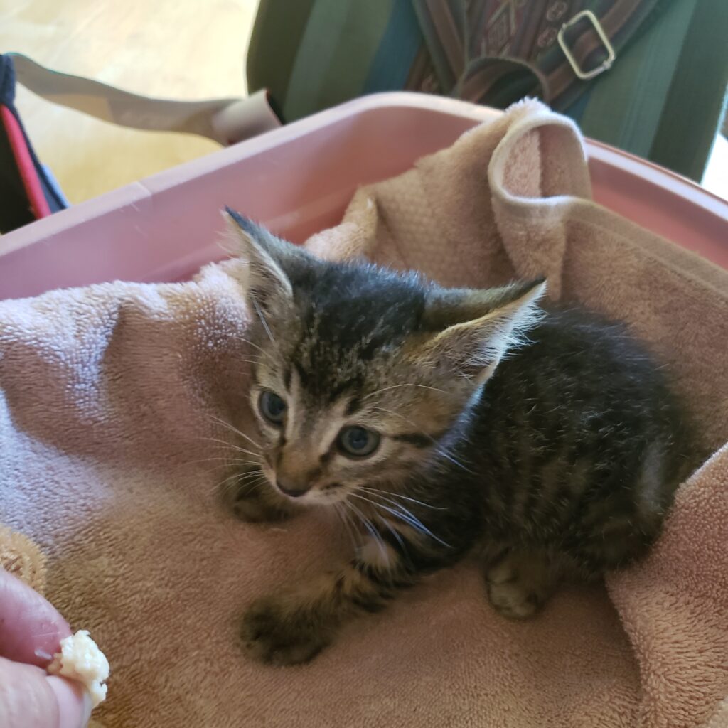 “I heard an odd sound that at first I thought was some kind of bird, so I was looking around to see what it was,” Bachmann recalls. “The sound was nonstop. There is an area of shrubs and rosebushes at the intersection, and I discovered the sound was a tiny kitten crying. There was no other cat around and no people. I spent almost 45 minutes trying to coax him out of the bushes and finally realized I would have to come back with some food.”