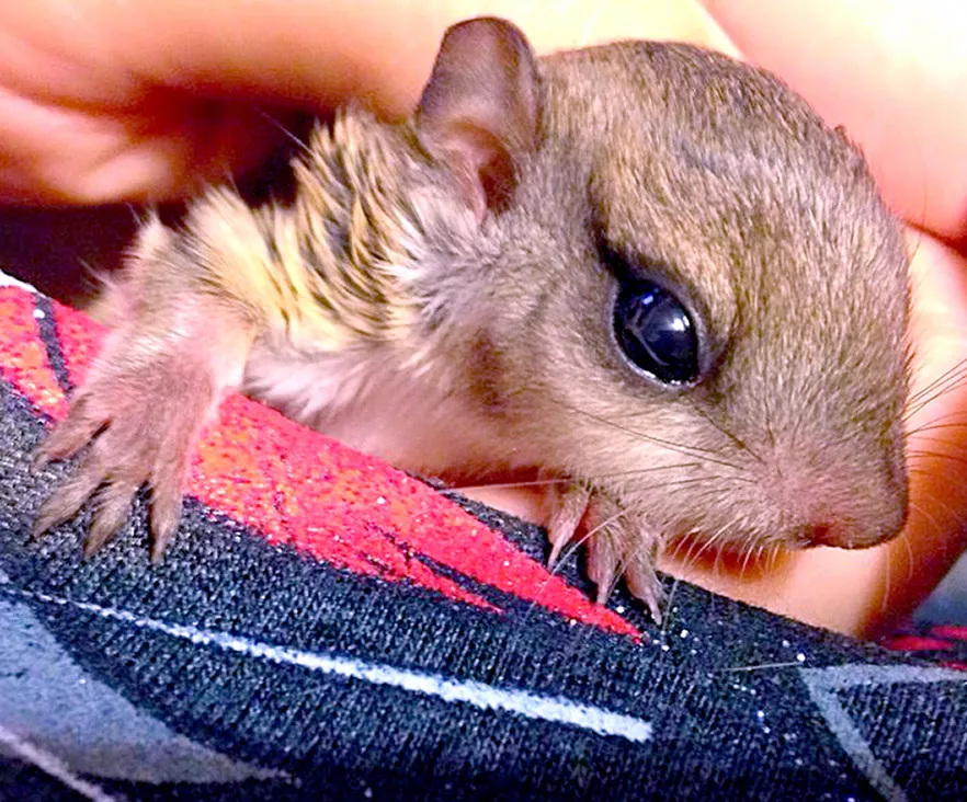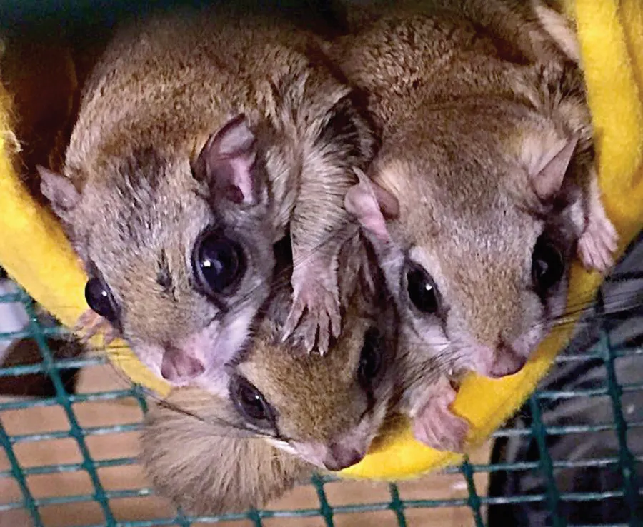 I still remember holding them in my hand for the first time. They were three little males, about the size of mice, with enormous eyes and tails tipped with fur that grew to flatten on each side—nature’s rudder for gliding through the trees. Their coats were satin, unlike the coarse feel of their larger cousins’ pelts. As per most juvenile wildlife, they stayed frozen in my hand, full of fear. (An aside: people often tell me they have special “moments” of bonding with infant critters as they hold and cuddle them. That’s not what it is. It’s stark terror on behalf of the baby. They’re hoping they can stay still long enough to disappear or something, as they’re programmed to interpret you as a carnivore ready to make them a meal. While rehabbers usually have to touch them anyway, we follow protocol to ease our way into it and gain trust through food and time.) I promised them I would do my best.