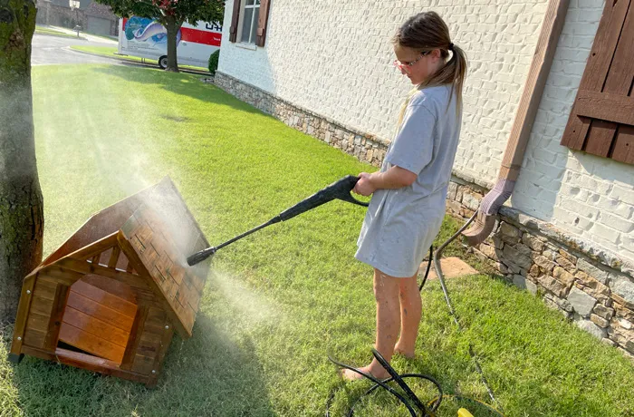 in a neighborhood pool or enjoying shaved ice at a snow-cone shack, but Annie, Grace, and Reese are hard at work. They are busy painting the doghouse they built from scratch after months of research and planning.