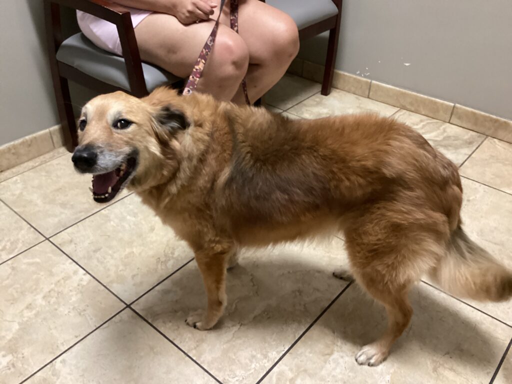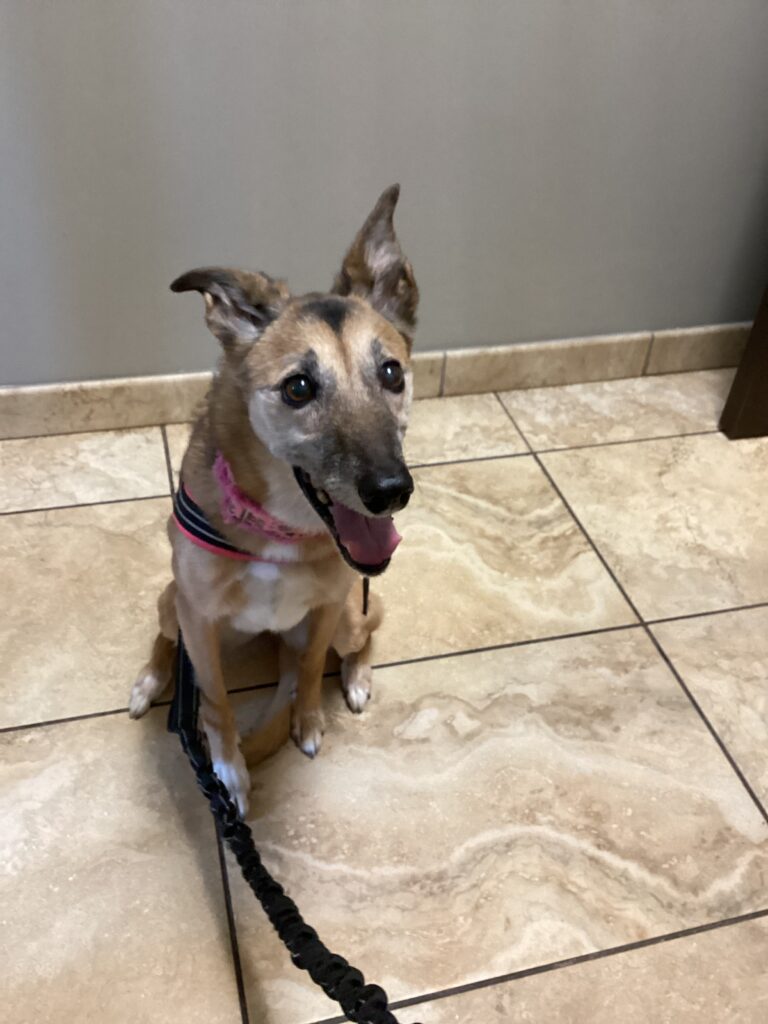 During a Champs Foundation therapy visit, Pixie Sykes smiles at the camera. She turns 12 years old in January 2025. As a participant in the STAY study, Pixie has more stamina and appears to have returned to her puppyhood.