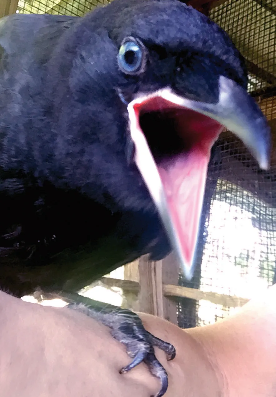 Let’s just say your doorbell rings one day, and there sits a baby crow. You know it’s a baby; stubby feathers are a deep charcoal, not jet black; eyes are blue, and when you lean down for a better look, an open beak reveals a brilliant ruby mouth. The sound coming from those ruby depths reminds one of creaking hinges. He is hungry.