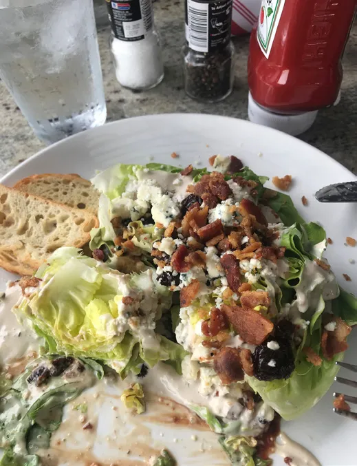 I ordered the Baby Wedge Salad with bibb lettuce, port cherries, bleu cheese crumbles, Greer’s bacon, grilled crostini and bleu cheese dressing. Don’t let the name fool you; it’s a large portion and delicious.