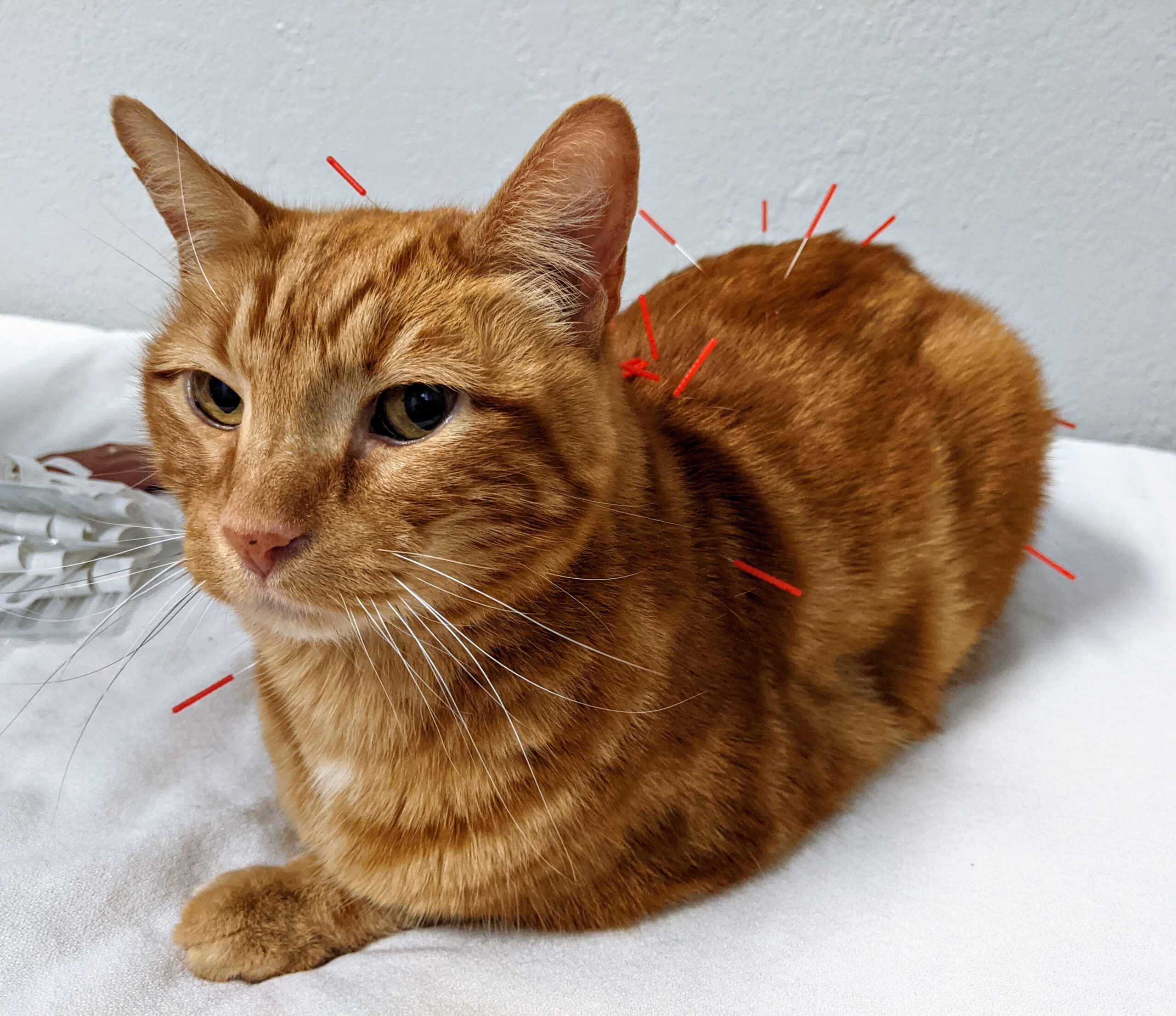 Dr. Bren Milleson, Tulsa Town Veterinary Hospital, is Bam Bam’s primary vet, providing the general health-care needs of the handsome ginger cat. Alternating weeks, Bam Bam gets special treatments — chiropractic adjustments to realign his spine from Dr. Neely Shenloogian, Green Country Animal Chiropractic, and acupuncture treatments from Dr. Heather Owen, Animal Acupuncture, to relieve pain and promote well-being.