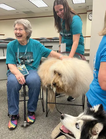 Charlee (owned by Daryll Cantrell) pays a visit to student Kathryn Pierce and camper Bill Scott at the Cowboy Aphasia Camp.