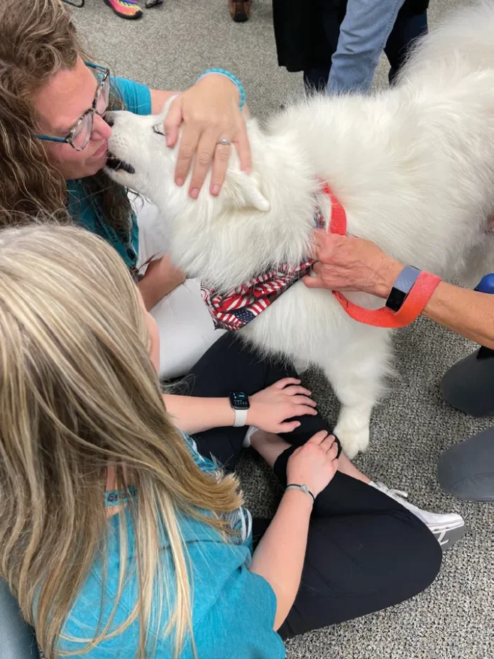 One of those volunteers is Vickie Cupps, president of Karing K9s and a national tester and observer for the Alliance of Therapy Dogs (ATD). She was one of five dog owners who visited the OSU-Tulsa campus on June 3 with their pooches.