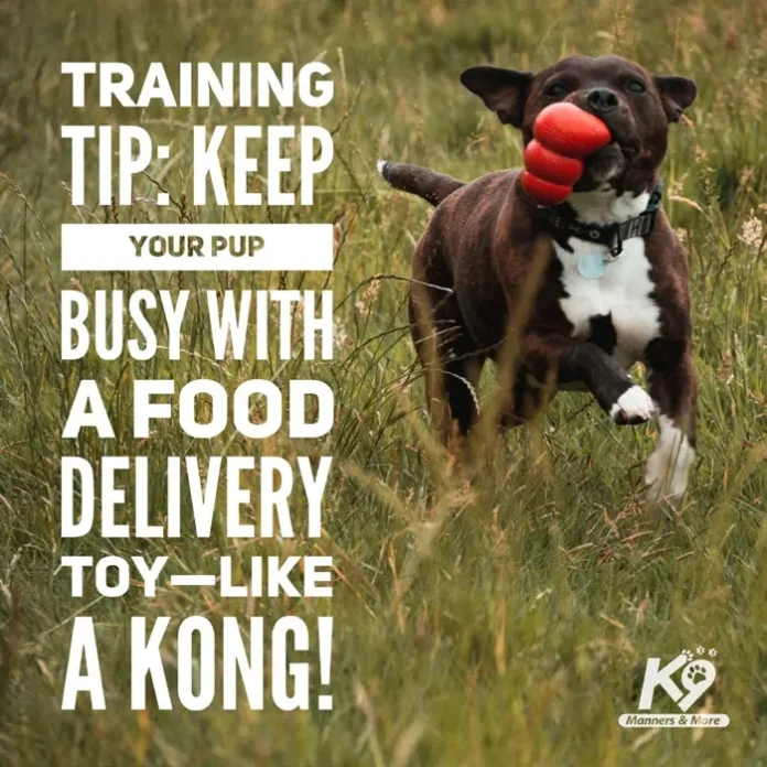 A food delivery toy is different from a chew toy. It is a safe vessel that when filled with kibble or yummy concoctions creates a situation where your dog must work to get the food from it. You put a stuffed food toy in with a dog in a crate or other confinement.