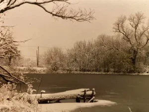 I saw no sign of Spot, so I began to dig furiously through the snowdrift with my mittens, thinking I would find his body underneath. I dug and dug as if I were a dog myself, seeking a bone I had buried weeks ago. I knelt in the snowdrift, my heart sinking. I remembered knocking over Spot’s frozen water bowl, and deep down, I knew. I stood up, afraid to look for fear I might actually see him. I slowly turned to face the painful north wind, snowflakes stinging my face and my eyes adjusting, trying to see the pond. There on the bank of the pond at the base of our